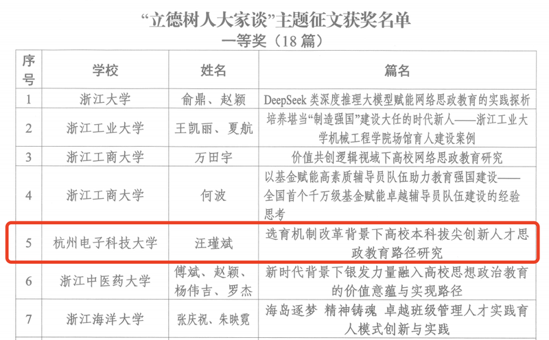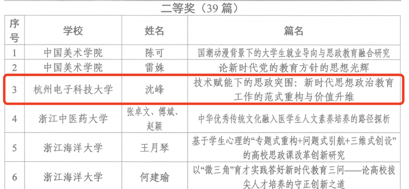浙江省高等教育学会思想政治教育分会、《高校思想政治工作》编辑部近日公布了“立德树人大家谈”主题征文活动获奖结果。我校卓越学院学工办主任汪瑾斌撰写的《选育机制改革背景下高校本科拨尖创新人才思政教育路径研究》荣获一等奖、电子信息学院辅导员沈峰撰写的《技术赋能下的思政突围:新时代思想政治教育工作的范式重构与价值升维》荣获二等奖。